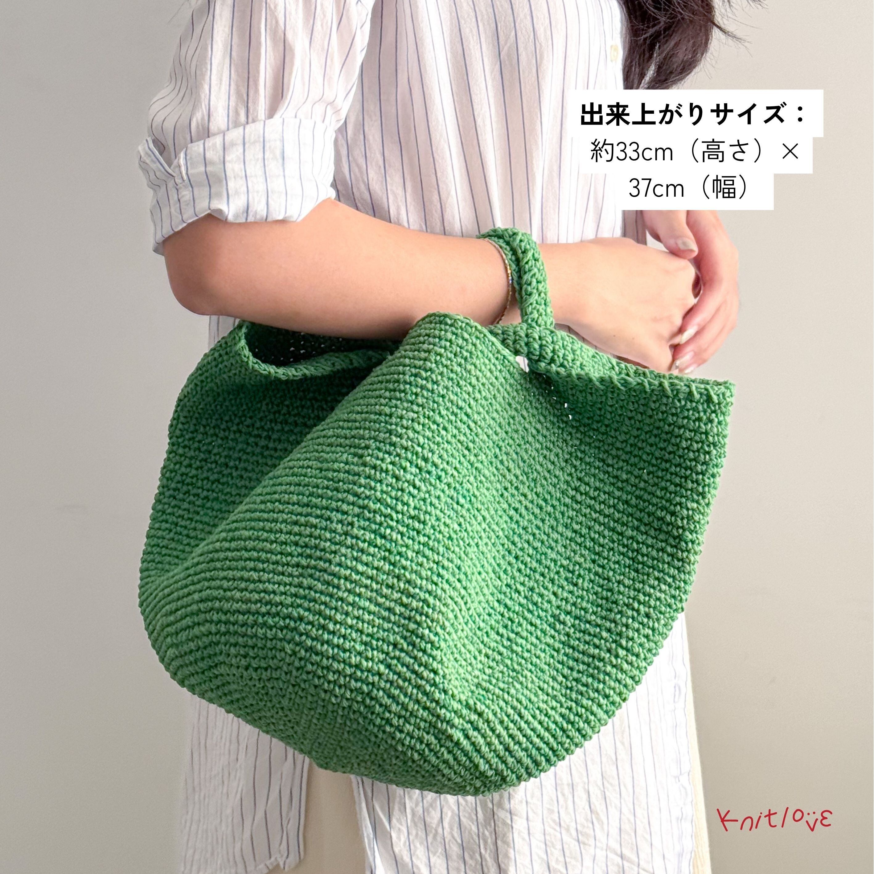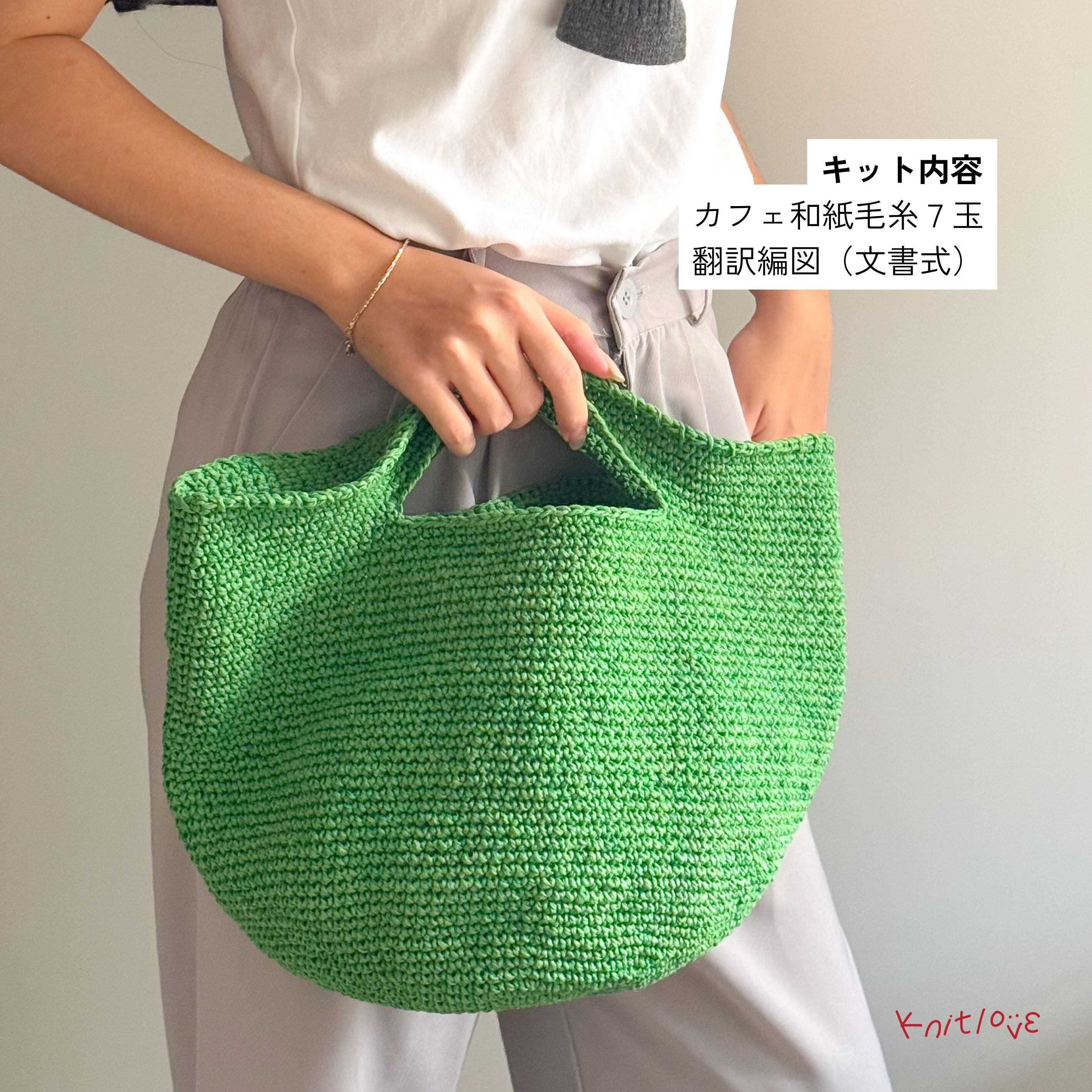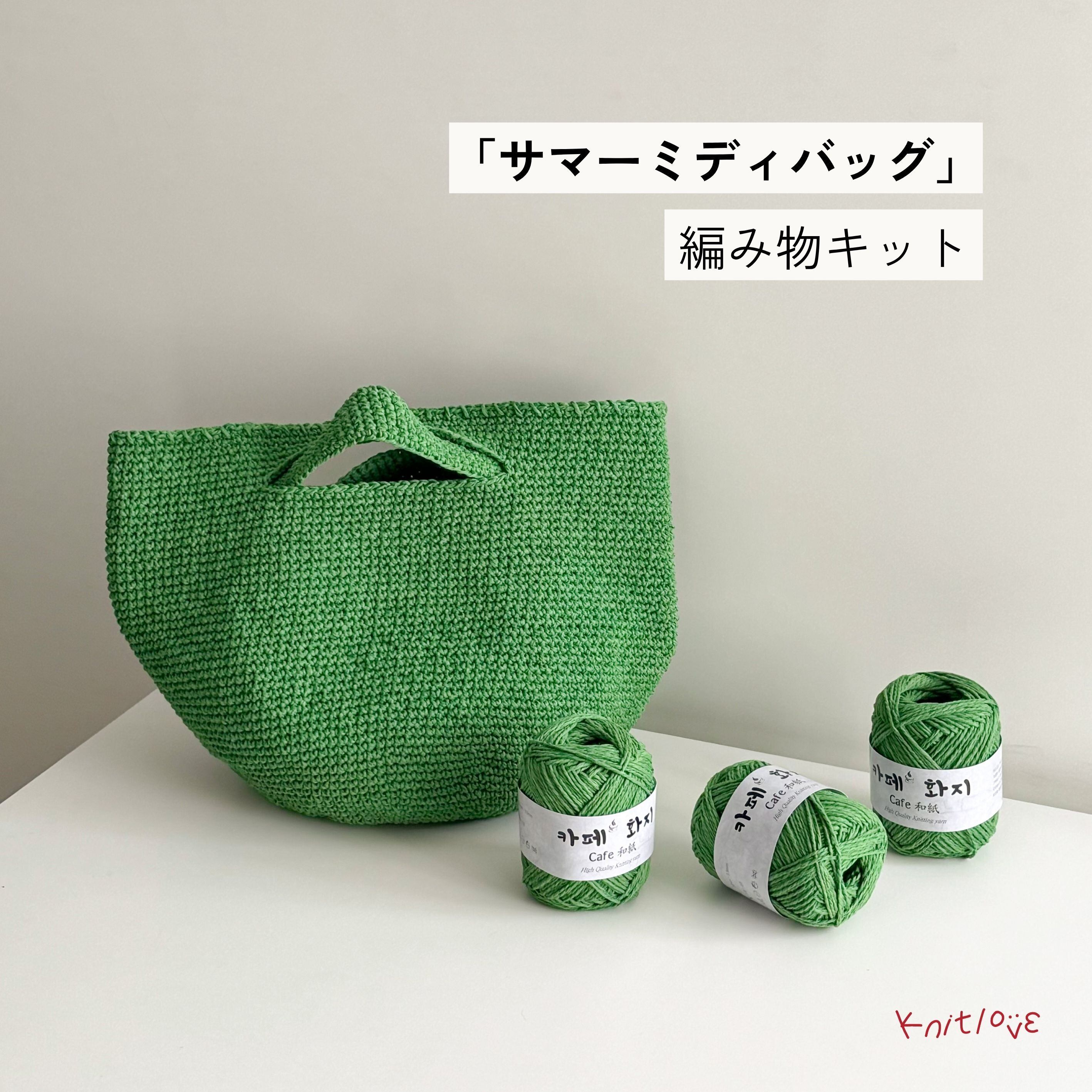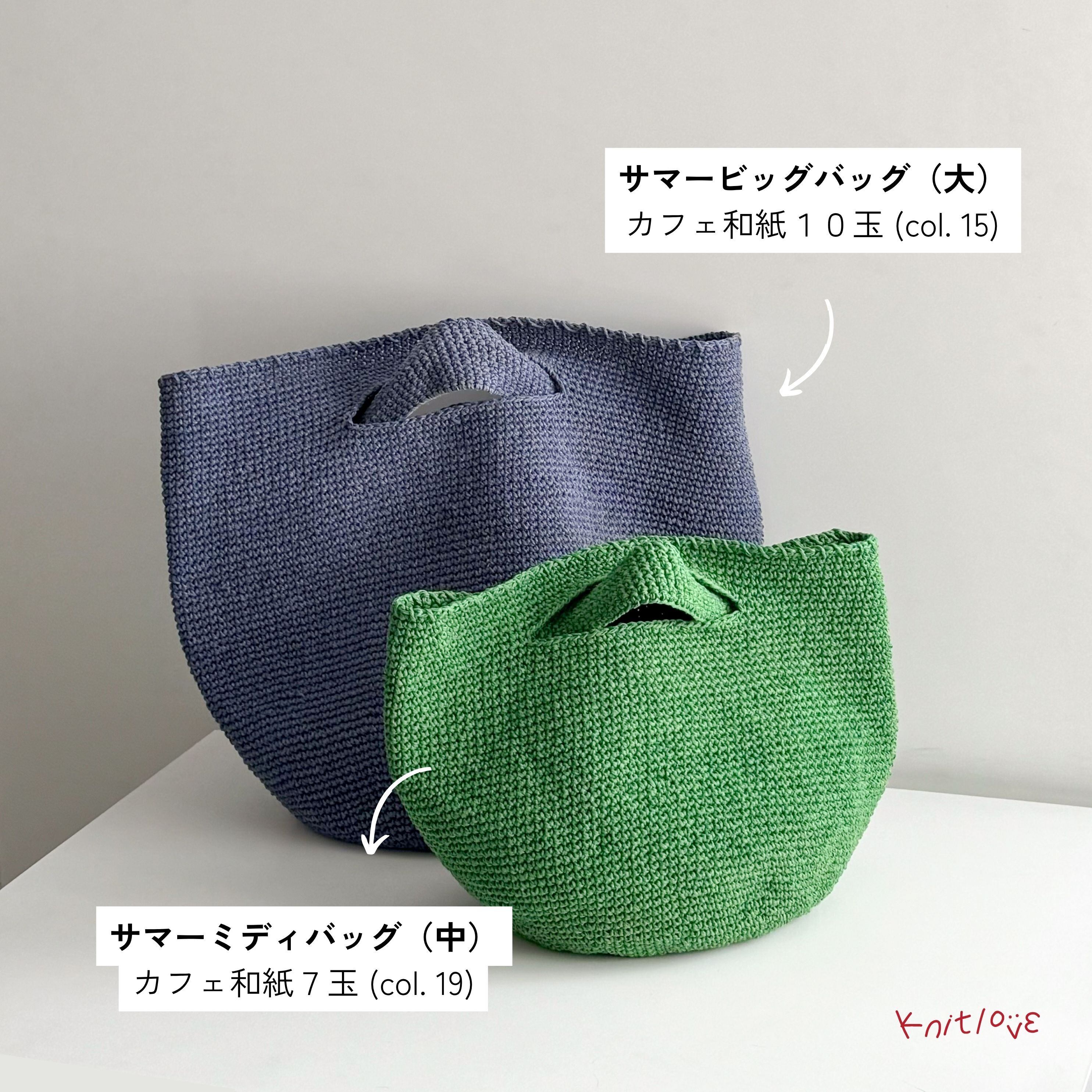 日常使いにちょうど良いサイズ感のサマーミディバッグ。韓国産の糸「カフェ和紙/카페화지」(レーヨン30%、PET60%、ポリ10%)を使用し、軽くて丈夫、ナチュラルな風合いが魅力です。
